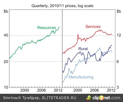 Сильная национальная валюта приводит к замедлению роста ВВП в ориентированной на экспорт экономике Австралии, что выражается в ухудшении условий торговли и сокращении объемов реализации промышленных товаров и услуг за пределы страны.