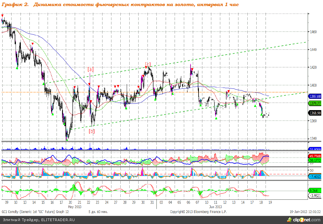 На часовом графике (график 2) котировки фьючерсных контрактов на золото вышли за пределы умеренно восходящего канала, тем самым лишившись локальной поддержки. Если мы обратимся к недельному графику 2, то увидим, цены на драгоценный металл продолжают находиться у нижней границы умеренно нисходящего канала, что в долгосрочной перспективе будет оказывать поддержку. Полагаем, в ближайшие день – два котировки золота могут вернуться к отметке $1380 за тройскую унцию