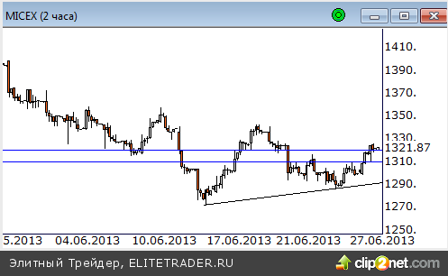Прошедший день завершился уверенным ростом. Котировки подошли к отметке 1320 пунктов, где проходит следующий уровень предложения, использовавшийся вчера для продаж. Локальный откат с текущих позиций не исключен. Однако он будет использоваться для покупок с дальнейшим преодолением максимума среды и ухода индекса в район отметок 1340-1350 пунктов.