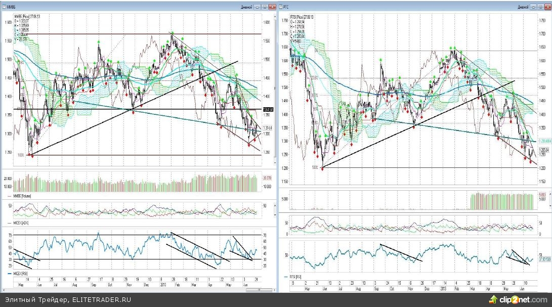 Сегодня пятница – конец не только текущей недели, но и месяца, II квартала и I полугодия 2013 года. Какие-никакие, но уже можно подводить первые итоги, и пока они, конечно же, неутешительны. Оба индекса ММВБ и РТС с начала года похудели на 11,14% и 17,48% соответственно. Июнь месяц имеет все шансы стать пятым подряд черным месяцем на РФР, ведь маловероятно, что покупатели сегодня смогут наверстать упущенное за один день.