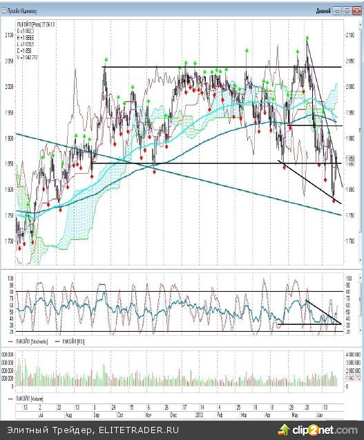 Учитывая, что они смогли вернуться в рамки большого «боковика», то теперь у них есть все шансы подняться в районы 1900-1910 и 1930-1940 рублей соответственно, где расположены ближайшие уровни сопротивления. Полагаю, что хотя бы до середины диапазоны котировки вполне могут отскочить, а там всё будет зависеть от прохождения уровней медленных скользящих средних ЕМА100 и ЕМА200 на днях.