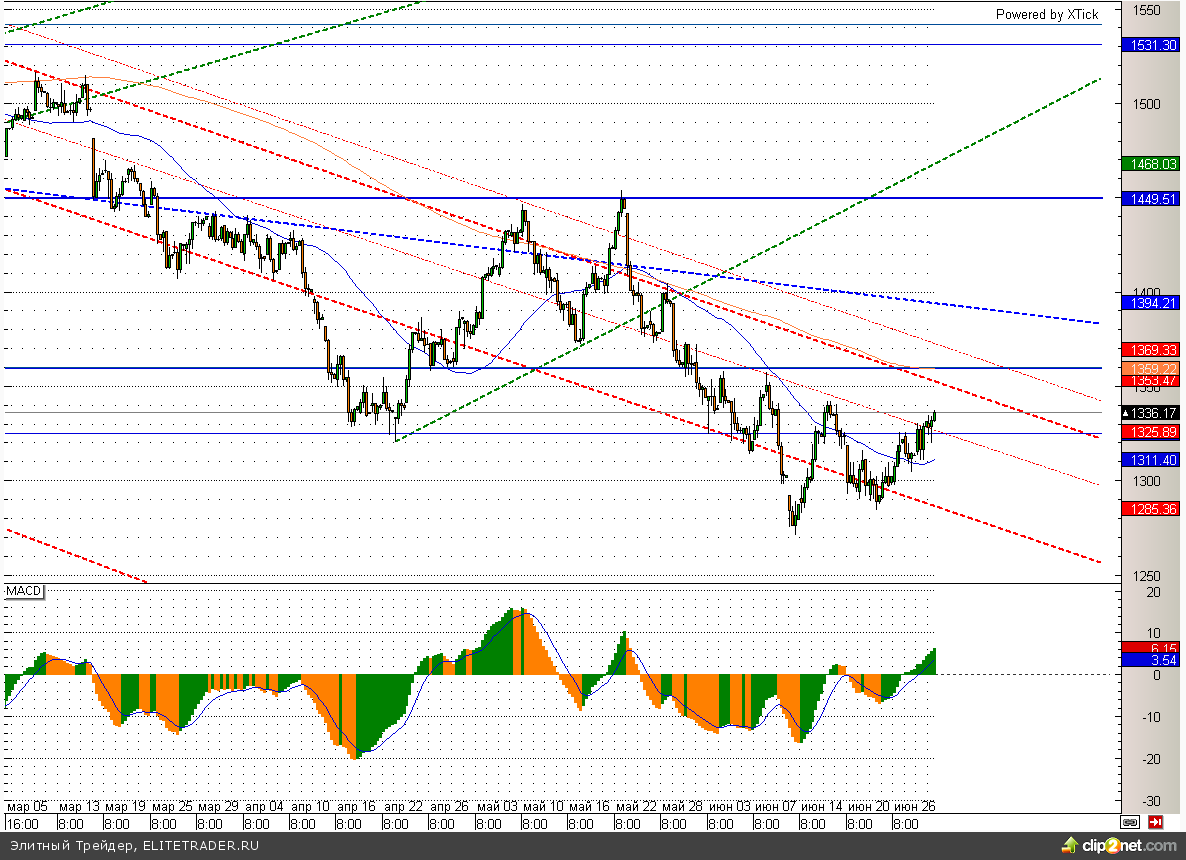 Российский рынок завершил торговую сессию понедельника на положительной территории, но рост составил всего 0,43% по ММВБ, что при сегодняшней потрясающей макроэкономической статистике выглядит очень странно. При этом еще утром ММВБ вообще собирался снижаться, но к середине торговой сессии «быки» смогли завладеть инициативой. Ближайшей целью по индексу является уровень 1350, но пока каждый сантиметр движения вверх дается с огромными усилиями. Поэтому вероятность продолжения роста с каждым днем становится немного ниже.