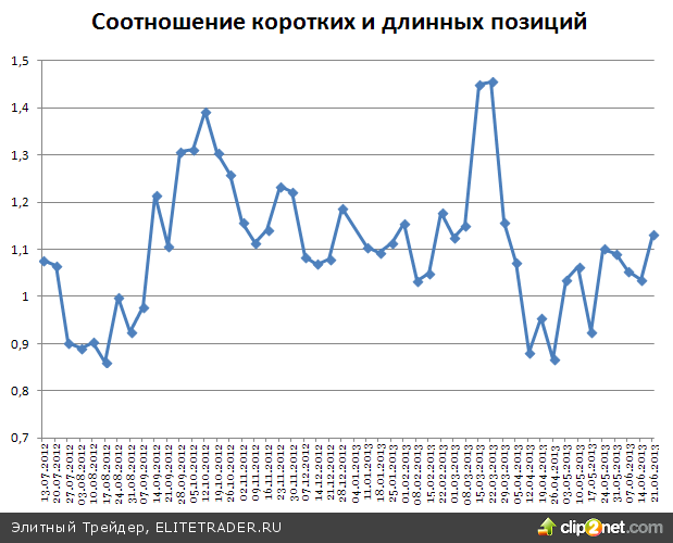 Обратив внимание на открытые юридическими лицами позиции по фьючерсу на индекс, можно заметить, что настроения крупных игроков за прошедшую неделю немного сместились в сторону продаж. Крупные участники закрыли более 52000 контрактов по длинным позициям и лишь 9000 контрактов по коротким. В результате соотношение коротких и длинных позиций сейчас составляет 1,13, при 1,03 на прошлой неделе.