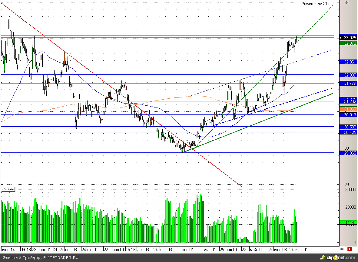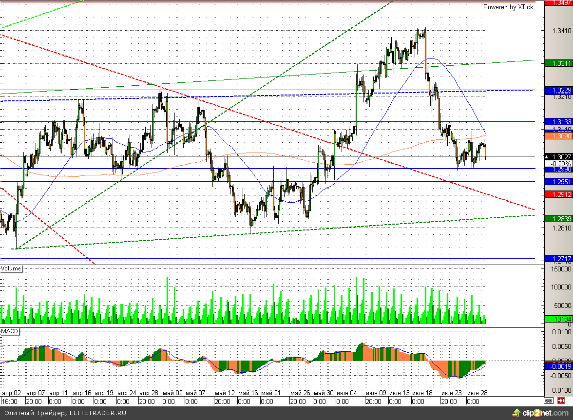 Рубль снижается к доллару на 7 копеек. При этом российская валюта сегодня обновила минимальные значения текущего года и уже торгуется ниже отметки 33. Несмотря на столь негативную динамику, есть целый ряд факторов поддерживающих рубль. Таким образом, ЦБ РФ продолжает проводить валютные интервенции и уже 2 недели продает примерно по 200 млн. долларов ежедневно. В свою очередь котировки нефти снова растут и уже торгуются выше отметки 103 по сорту Brent на фоне беспорядков в Египте. Между тем все вышеперечисленные факторы пока не в силах преодолеть страхов по поводу окончания стимулирующих программ в США и соответственно более жесткой денежно-кредитной политике. На этом фоне рубль снижается уже три недели, но может приостановить свое падение в самом скором времени. Драйвером ля роста вполне может стать рост российской экономики. Вчерашние данные по индексу деловой активности в производственном секторе (51,7) за июнь как раз дают возможность предположить это.