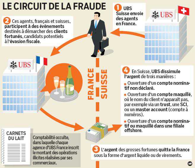 Банк UBS France подозревают в том, что его сотрудники не только находили для своих клиентов способы избежать уплаты налогов во Франции, но и помогали вернуть сэкономленные таким образом средства в законное обращение. Так, на французском сайте droit-finances.net приводится в пример следующий нехитрый способ отмывания денег, скрытых от французской налоговой администрации. Допустим, налогоплательщик открыл счет в швейцарском банке и внес на него незадекларированные средства. Затем он оформляет ссуду в этом же банке (или одном из его филиалов) на сумму, равную размеру незадекларированных средств. Далее недобросовестный налогоплательщик использует средства, полученные по «ссуде» для вполне законных целей, а «задолженность» на его банковском счете погашается за счет незадекларированных средств.