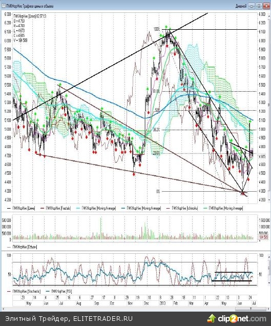 Напомню, что я ожидаю выхода котировок из сформированного ранее «треугольника», но пока ни одного дня не было закрыто выше уровней 4847 и 4769 рублей, являющимися дневными фракталами на покупку. Вчерашний откат цены до уровня быстрой скользящей средней ЕМА21 на днях вполне допустим, но при этом ценам желательно ниже уже не уходить.