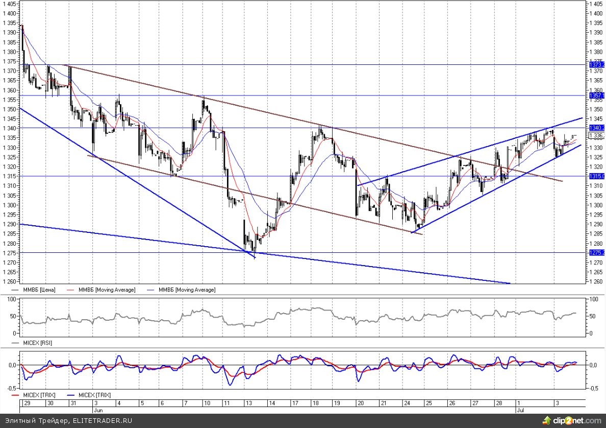 После небольшого снижения индекс ММВБ во второй половине торгов возобновил подъем, оттолкнувшись от нижней границы восходящего клина с конца июня в районе 1325 пунктов. На отскоке игроки могут вернуть индекс к уровню поддержки на 1340 и даже попробовать его преодолеть.