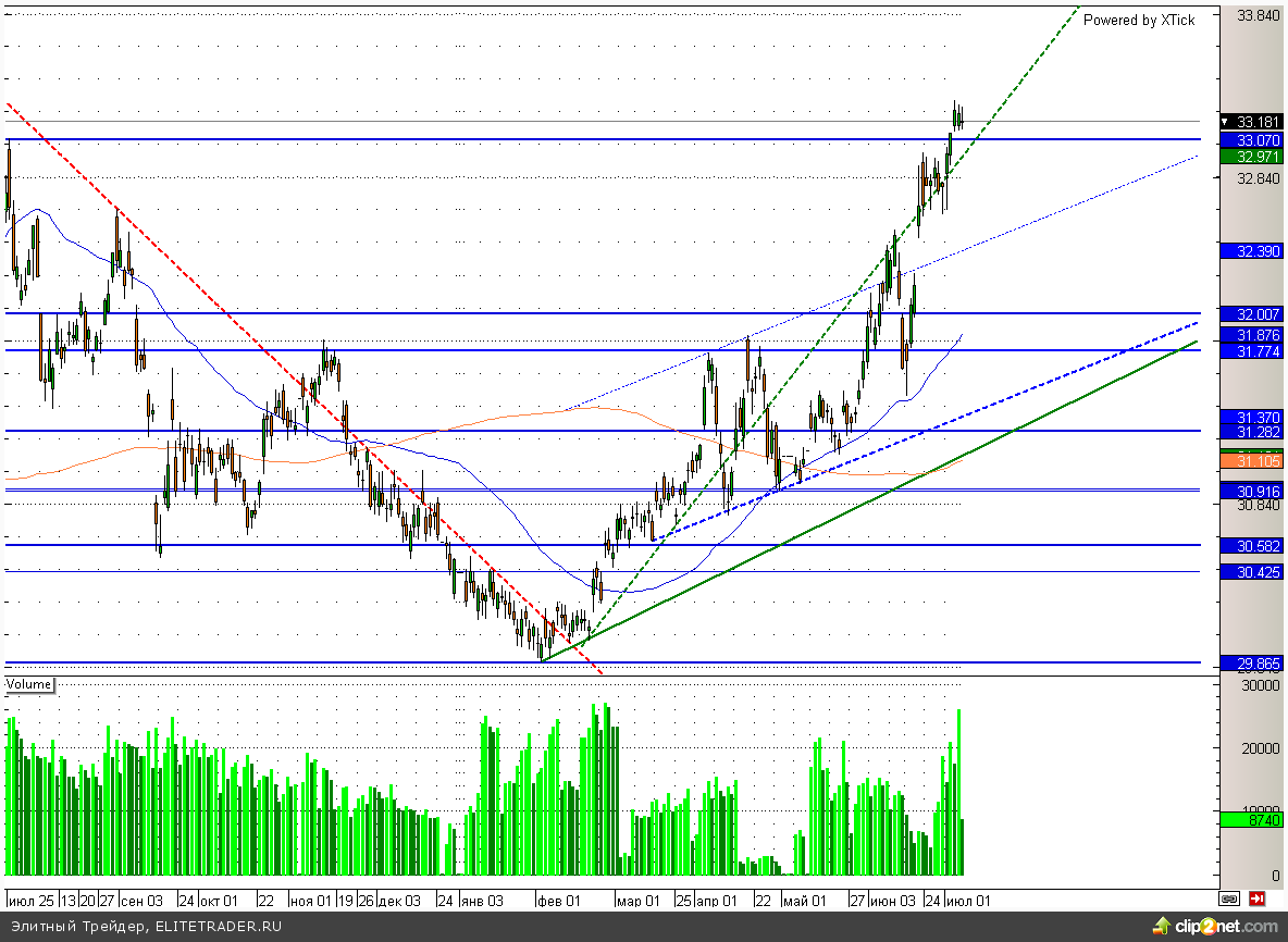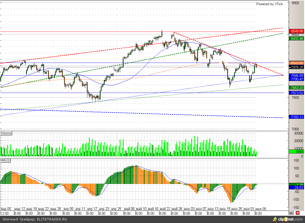 Тем временем Dax также подобрался к трендовой линии и может немного приостановить рост последних дней. При этом сигналом для дальнейшего роста станет пробой отметки 8020.