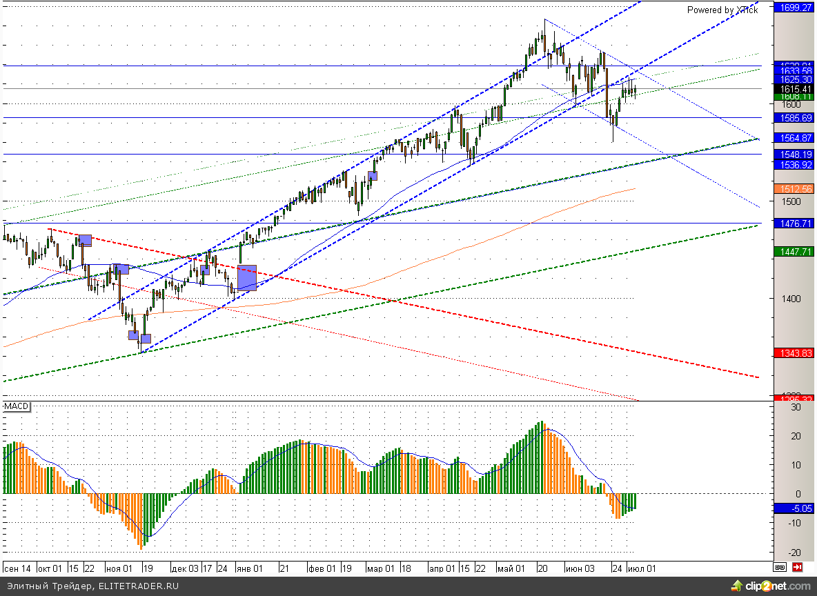 Индекс S&P500 подобрался прямиком к восходящей трендовой линии на уровне 1630. При этом здесь проходит также нисходящая трендовая линия, что лишь добавляет значимость1630. Данному уровню вполне по силам немного остудить пыл разбушевавшихся в последнее время бычков.