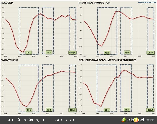 Если QE1 действительно дала скачок, то в период последней программы явно наблюдается стагнация по всем показателям. Исходя из непростой ситуации, можно предположить, что ФРС просто не в состоянии прекратить свою финансовую поддержку в ближайшее время. Zerohedge.com