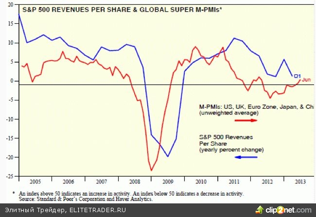 Почему рынок США обычно растет в первый день месяца, пытается разобраться Эд Ярдени в блоге Dr.Ed’s blog. По его версии, наиболее вероятной причиной является публикация в начале месяца индекса производственной активности PMI, и этот индикатор сохраняется выше 50 пунктов. Ярдени приводит график, на котором построил композитный индекс PMI Японии, КНР, Великобритании и США и сравнил его с выручкой компаний из индекса S&P 500. BusinessInsider