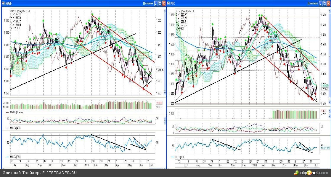 Чисто технически пятничный неудавшийся рост у нас, конечно, немного смущает, но совсем не портит имеющейся картины торгов. Логично было увидеть подъем индекса ММВБ к максимуму, расположенному на отметке 1357,17 пунктов и заминку на этом рубеже, ведь помимо пика от 10.06, рядом в зоне ~1360 пунктов располагается горизонтальный уровень сопротивления. C первого раза покупателям не удалось проскочить столь важное сопротивление, но в случае закрепления над уровнем дневного фрактала на покупку, шансы увидеть индекс ММВБ в районе 1400-1410 пунктов существенно возрастут. Помимо этого обращаю внимание игроков на тот факт, что индикатор Ишимоку на днях дал пересечение на «лонг».
