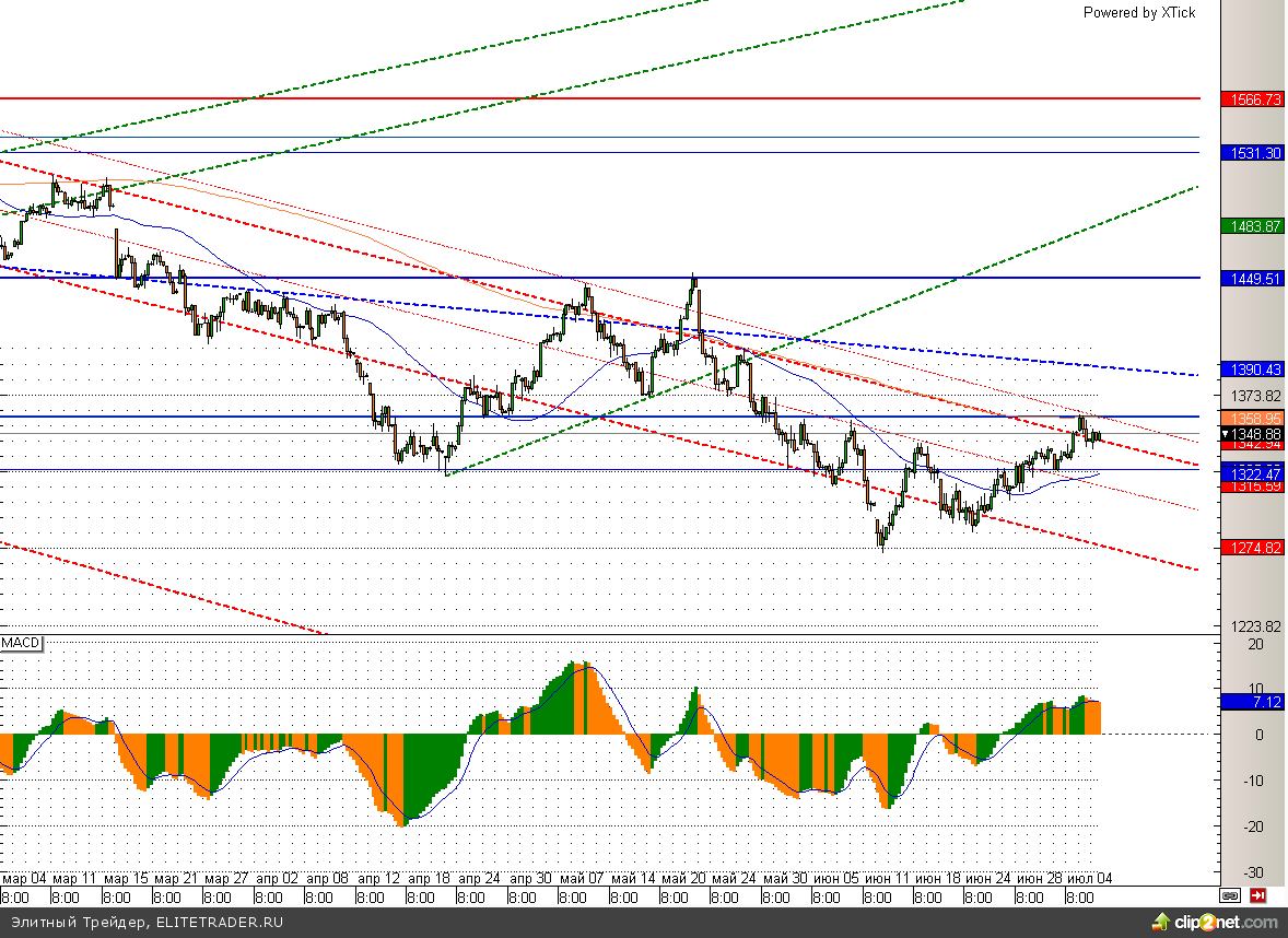 Российский рынок завершил торговую сессию понедельника на положительной территории. При этом «быкам» сегодня удалось организовать отскок от 1340 по ММВБ. На данной отметке проходит нисходящая трендовая линия и от нее вполне может начаться полноценный рост. Ближайшим сопротивлением, пробой которого станет сигналом для продолжения роста, является уровень 1360.