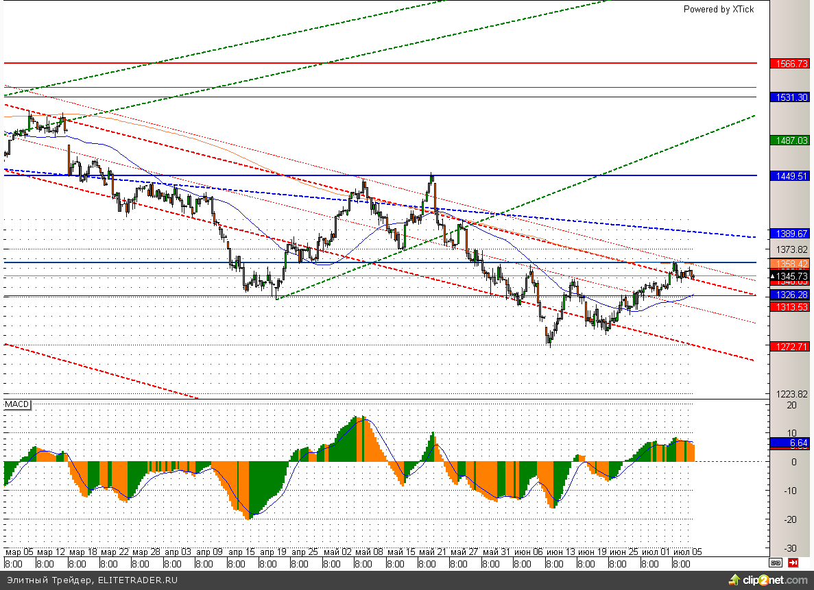 Российский рынок завершил торговую сессию вторника разнонаправленным движением котировок. Индекс ММВБ упал на 0,23% и в ходе торговой сессии даже тестировал на прочность отметку 1340, где расположилось его серьезная поддержка в виде нисходящей трендовой линии. Далее если пробой вниз данного уровня все-таки произойдет, то может последовать ускорение снижения, первой целью которого станет уровень 1325. В обратном случае первое сопротивление по индексу располагается на 1360.