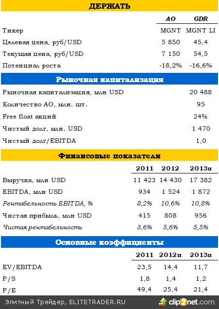 Ожидаем, что акции Магнита в целом сохранят сильные позиции на рынке, однако, с учетом достигнутых уровней, дальнейший рост считаем спекулятивным. Происходящее в бумагах Магнита, определенно, является «пузырем», но в силу ряда причин этот «пузырь» является довольно стабильным, и пока мы не видим поводов для того, чтобы он «лопнул». Сохраняем рекомендацию ДЕРЖАТЬ по бумаге.