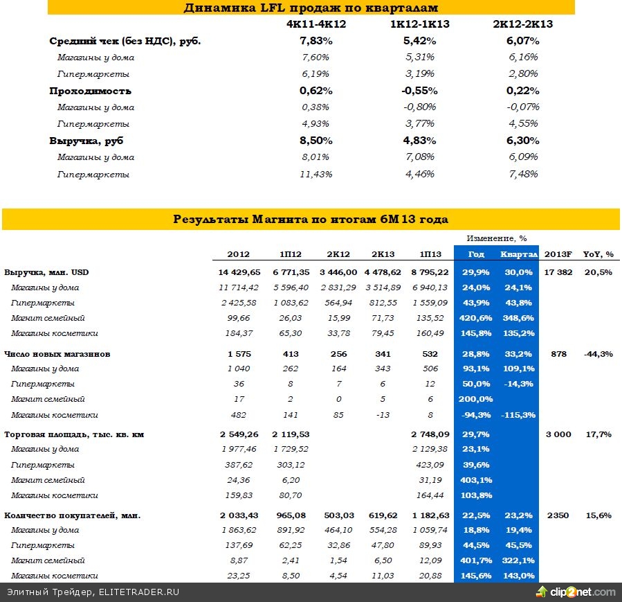 Летние месяцы традиционно являются не слишком активными в продуктовом ритейле из-за сезонного снижения потребления. Магнит не является исключением в этом плане. В июне выручка упала на 1,7% по сравнению с маем (на 4,9% в долларовом выражении). В годовом сопоставлении рост снизился до 30,3% в рублях против 34,5% в мае. Динамика выглядит не слишком радужной, с учетом того, что в мае 2013 было 13 нерабочих дней против 10 в мае 2012, и майские результаты можно назвать достаточно слабыми. Мы ожидали замедления темпов роста выручки, поэтому наблюдаемая тенденция в целом соответствует нашим прогнозам, однако рынок может несколько разочароваться в результатах.