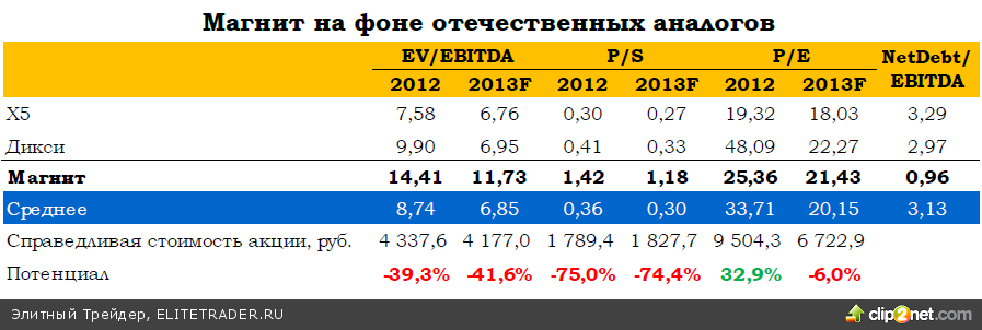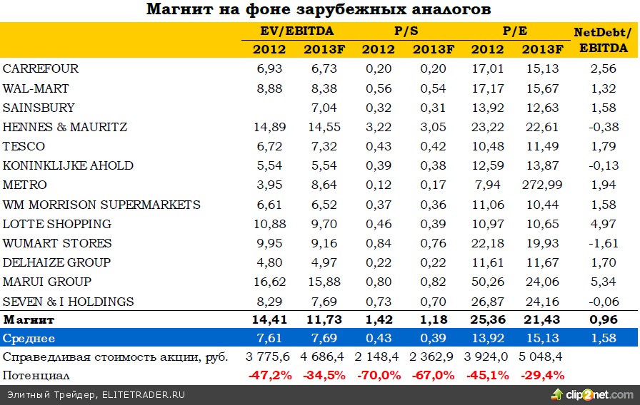 Мы позитивно смотрим на стратегию компании, на результаты, которые сеть демонстрирует в настоящее время и на темпы роста. В то же время, мы считаем, что рынок излишне оптимистичен в оценке рыночных рисков Магнита. И те премии, которые бумаги сети демонстрируют по отношению к акциям конкурентов, хотя и оправданы в значительной степени, но преимущественно связаны с «безальтернативностью» при инвестировании в потребительский сектор.