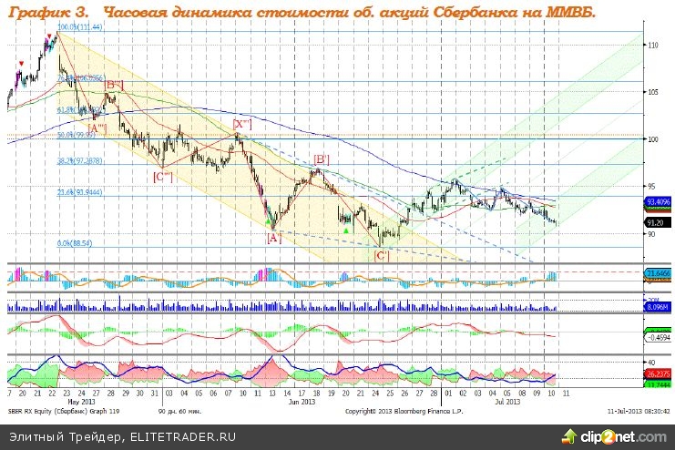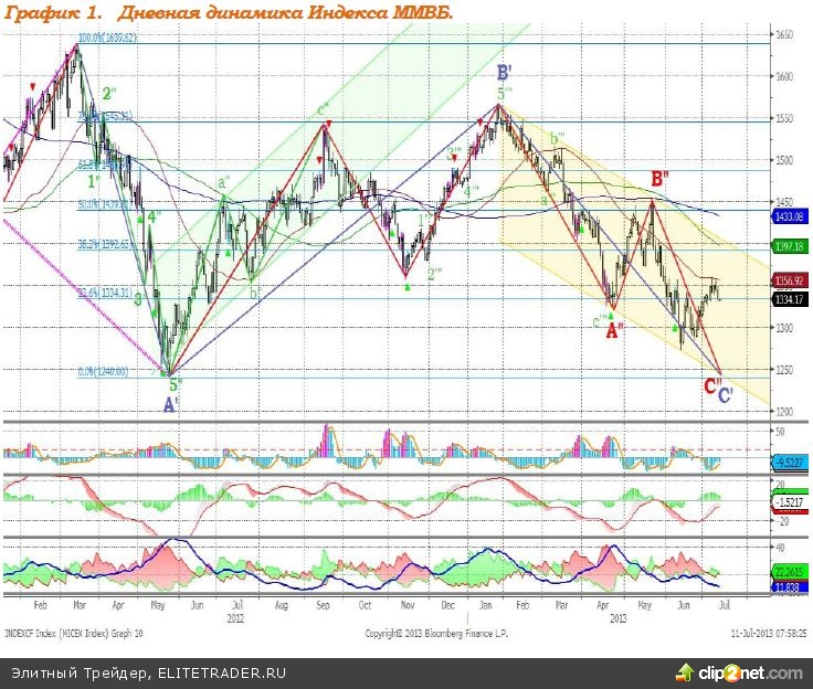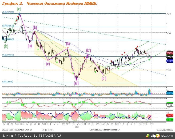 Индекс ММВБ – в последние дни не показывает выраженной динамики. MACD выглядит нейтрально. DMI+ находится ниже DMI-, ADX находиться в средней части шкалы и направлен вверх, что говорит о наличии нисходящего локального тренда. Индикатор, основанный на динамике ADX, 5 июля повторил сигнал к снижению. Рекомендация: Вне рынка