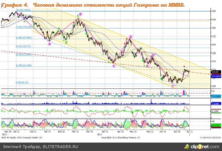 Газпром – растет в границах нисходящего канала. MACD сформировал сигнал вниз. ADX указывает на отсутствие тренда. Индикатор, основанный на динамике ADX, 5 июля сформировал сигнал вниз. Сопротивление: 113,50. Поддержка: 119,00. Рекомендация: Вне рынка