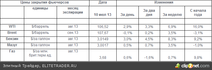 Цены дальних фьючерсов на нефть по обе стороны Атлантики оказываются ниже цен ближних контрактов. По европейской нефти марки Brent сохраняется беквордация и цены дальних фьючерсов на 1,8% ниже цен ближайших фьючерсов. По нефти марки WTI беквордация составляет 4,0%. Разница цен ближайших фьючерсов бочки нефти марки Brent и североамериканской легкой нефти марки WTI резко уменьшилась за счет подскока цен в США и на закрытие 9 июля 2013 года составляла $1,15 за баррель. Тем самым период существенно меньших цен в США по сравнению с ценами в Европе уходит в историю.