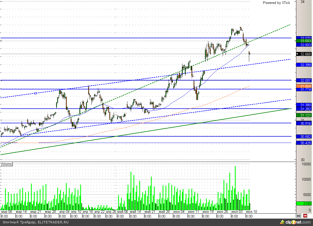 Рубль прибавляет к доллару более 25 копеек. При этом дополнительную поддержку российской валюте оказывают высокие цены на нефть, которые по сорту Brent уже практически добрались до 110 долларов за баррель. Между тем Банк России продолжают продавать иностранную валюту объемом 200 млн долларов, что также позитивно для рубля. Таким образом, рубль уже ожидаемо добрался до своего ключевого сопротивления на уровне 32,5 и в краткосрочном периоде вполне может продолжить эту позитивную тенденцию. Поддержкой для него может стать увеличение спроса на фоне начала налогового периода в стране. Впрочем, с покупкой российской валюты лучше повременить как минимум до заседания Банка России.