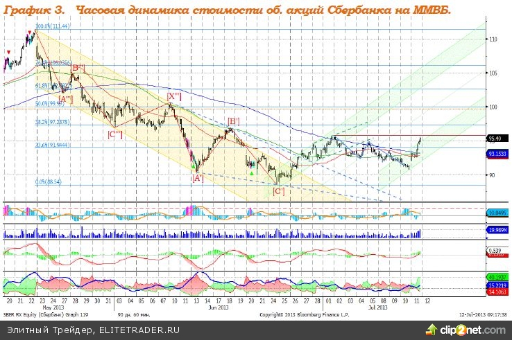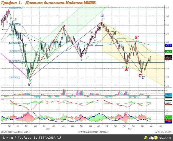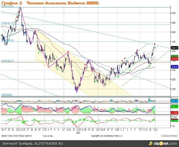 Индекс ММВБ – достиг верхней границы нисходящего тренда. MACD отрабатывает сигнал вверх. DMI+ находится выше DMI-, ADX находиться в верхней части шкалы и направлен вверх, что говорит о наличии восходящего локального тренда. Индикатор, основанный на динамике ADX, 11 июля дал сигнал к снижению. Рекомендация: Вне рынка