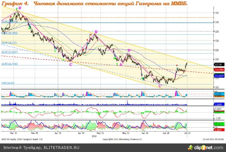 Газпром – у верхней границы нисходящего канала. MACD сформировал сигнал вверх. ADX указывает на наличие восходящего тренда. Индикатор, основанный на динамике ADX, 5 июля сформировал сигнал вниз. Сопротивление: 113,50. Поддержка: 119,00. Рекомендация: Вне рынка