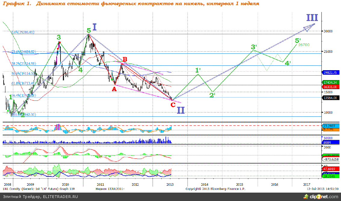Во втором полугодии мы ожидаем некоторого оживления мировой экономики, что должно позитивно отразиться на стоимости металлов. Девять месяцев назад, в начале октября 2012 года, мы технически рассматривали динамику котировок никеля (обзор от 3.10.2012). Тогда мы ожидали продолжения снижения стоимости металла, завершения формирования подволны C и вместе с ней волны II. На тот момент котировки фьючерсного контракта на металл были на уровне $18400 за контракт, целью предполагаемого снижения был указан уровень $12900. Котировки снижались немного быстрей наших ожиданий и достигли нижней границы канала в чуть более высокой точке, а именно на отметке $13218. Здесь высока вероятность зарождения восходящего тренда, в связи с чем обращаем ваше внимание и на акции ГМК «Норильский никель», см. обзор «ГМК Норильский никель: точка входа», которые могут начать двигаться вверх опережающими Индекс ММВБ темпами.