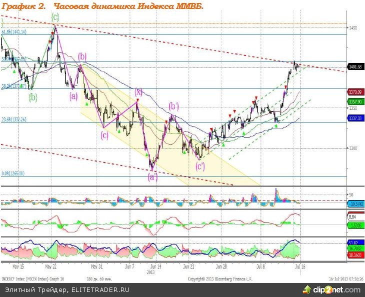 Индекс ММВБ – достиг верхней границы нисходящего тренда. MACD сформировал сигнал вниз. DMI+ находится выше DMI-, ADX находиться в верхней части шкалы и развернулся вниз, что говорит о замедлении восходящего локального тренда. Индикатор, основанный на динамике ADX, 11 июля дал сигнал к снижению. Рекомендация: Вне рынка
