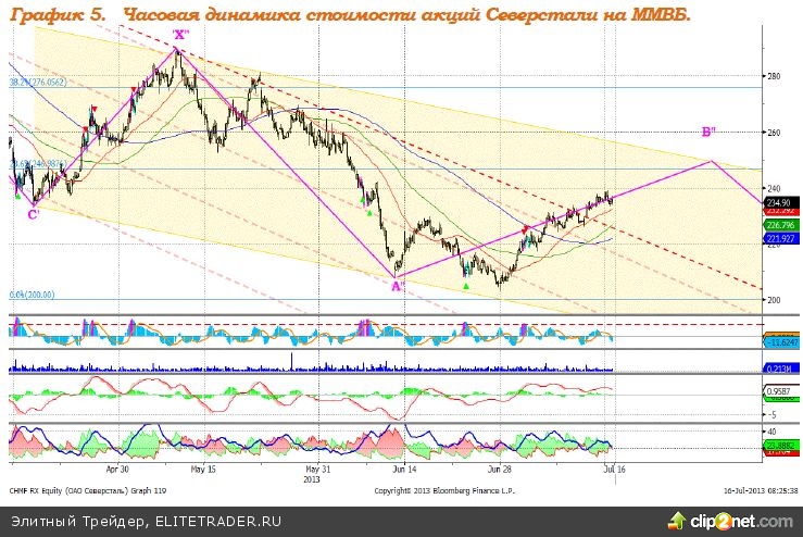 Северсталь – преодолела верхнюю границу нисходящего канала, после коррекционного снижения высока вероятность продолжения роста. MACD сформировал сигнал вниз. ADX указывает на прекращение восходящего тренда. Индикатор, основанный на динамике ADX, 2 июля дал сигнал к снижению. Поддержка: 230,0. Сопротивление: 237,0. Рекомендация: Покупать от уровня 226 руб