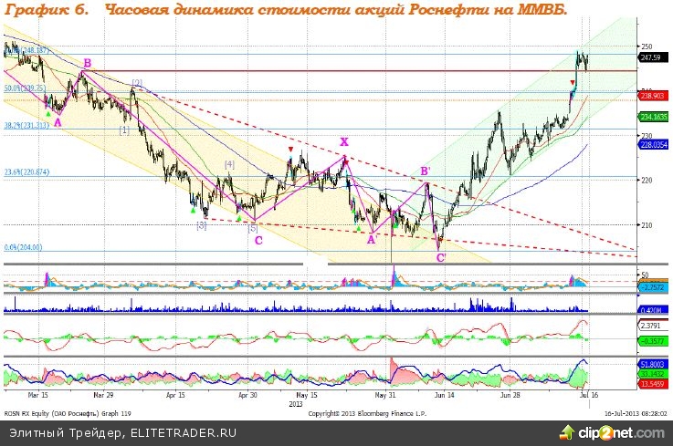 Роснефть – находится в пределах восходящего ценового коридора. Возможно, скоро будет сформирован сигнал к закрытию длинных позиций. Осторожные инвесторы могут закрыть ранее открытые лонги. MACD сформировал сигнал вниз. ADX указывает на замедление восходящего тренда. Индикатор, основанный на динамике ADX, 11 июля сформировал сигнал вниз. Поддержка – 240,00. Сопротивление – 248,00. Рекомендация: Держать