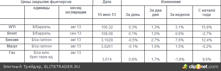 Цены дальних фьючерсов на нефть по обе стороны Атлантики оказываются ниже цен ближних контрактов. По европейской нефти марки Brent сохраняется беквордация и цены фьючерсов с погашением в декабре на 1,8% ниже цен сентябрьских фьючерсов. По нефти марки WTI беквордация составляет 3,1%. Дальние фьючерсы просто не смогли угнаться за стремительным ростом цен ближних. Разница цен ближайших фьючерсов бочки нефти марки Brent и североамериканской легкой нефти марки WTI закрытие 15 июля 2013 года составляла $1,76 за баррель, что стало самым низким значением за последние много месяцев