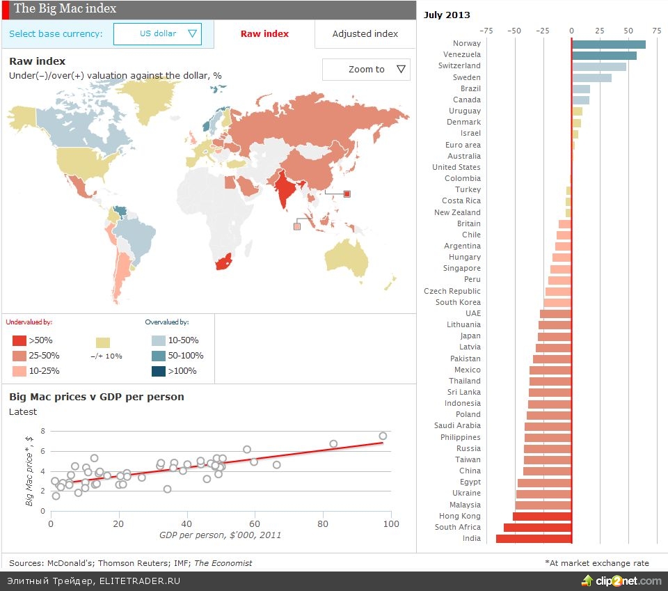 Из диаграммы можно понять, что самая переоцененная валюта - в Норвегии, Венесуэле и Швейцарии, самая недооцененная – в Индии, Южной Африке и Гонконге. При этом российский рубль смотрится очень дешевым, а вот американский доллар и евро по этому индексу находятся в зоне справедливой оценки. Economist.com