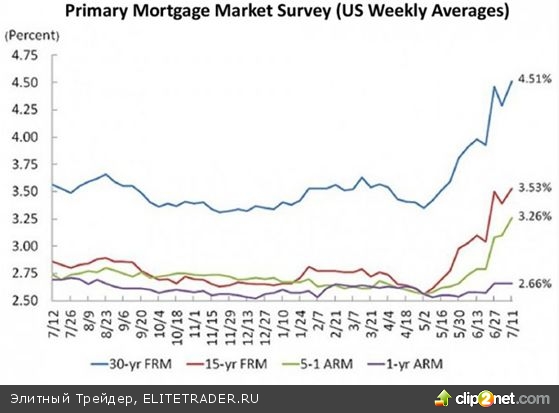 Вероятность сворачивания QE3 подняла не только ставки трежерис, но и ставки по ипотеке. По информации Freddie Mac, 30-летняя фиксированная ипотечная ставка выросла до двухлетнего максимума – 4.51%. «Сильные июньские данные по рынку труда повысили спекуляции на тему exit strategy», - говорит Фрэнк Нотафт, главный экономист из Freddie Mac. Теперь эксперты опасаются, что это может стать препятствием для восстановления американского рынка недвижимости. BusinessInsider.com