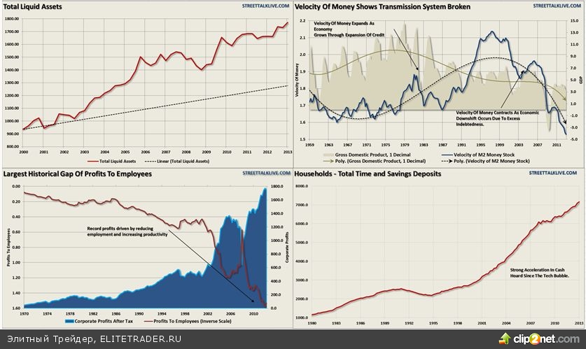 Графики: общая масса ликвидности в экономике США, оборачиваемость денег, «разрыв» в передаче прибылей компаний работникам, депозиты домохозяйств.