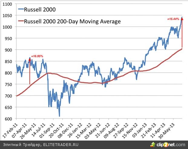 Джонатан Крински, аналитик Miller Tabak, отмечает, что рост индекса Russell 2000 достиг уже экстремальных значений. Так, индекс уже на 15% превысил 200-дневную скользящую среднюю, что является максимумом с мая 2011 года. BusinessInsider