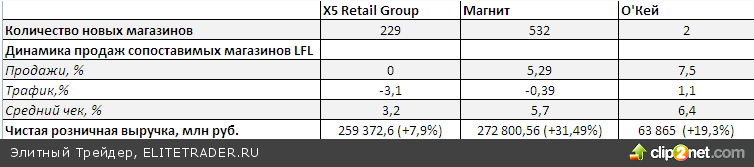 В пятницу, 12 июля, свои операционные результаты представила также компания O’кей. Ритейлер стал лидером сектора по показателю LFL-продаж, показав внушительный рост во втором квартале – на 9.6% г/г за счет темпов роста среднего чека (+7.8% год к году) и хорошего притока трафика (1.7% г/г). При этом расширение сети магазинов шло по-прежнему медленно: за полгода был открыт только один новый гипермаркет. При этом годовой ориентир по открытию новых магазинов составляет 12‐14. Тем не менее, ритейлер сообщил, что в 13 магазинах ведутся ремонтно-строительные работы, таким образом, возможно их открытие во второй половине года.