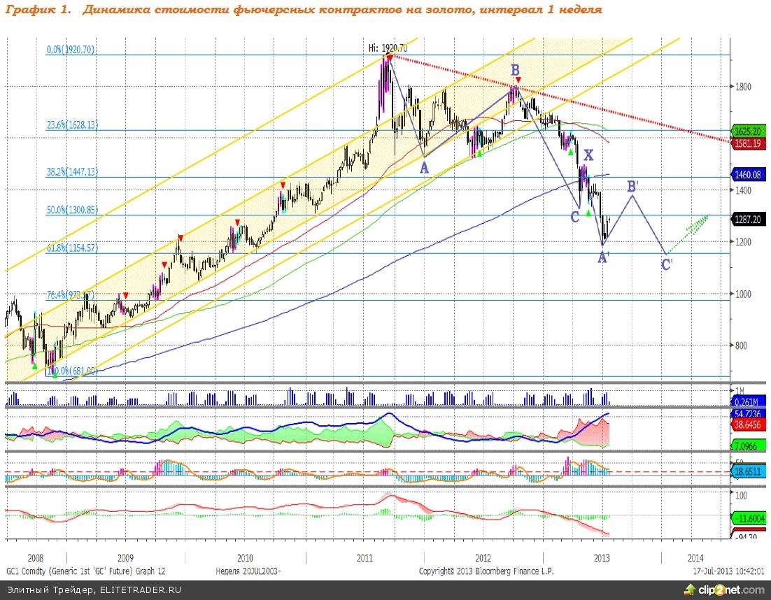Технически, в среднесрочной перспективе, после локального роста существует вероятность снижения котировок золота к уровню $1150 за тройскую унцию, после чего формирование структуры движения вниз будет окончено, цены могут возобновить рост. Предполагаемая динамика цен на металл отображена на графике 1.