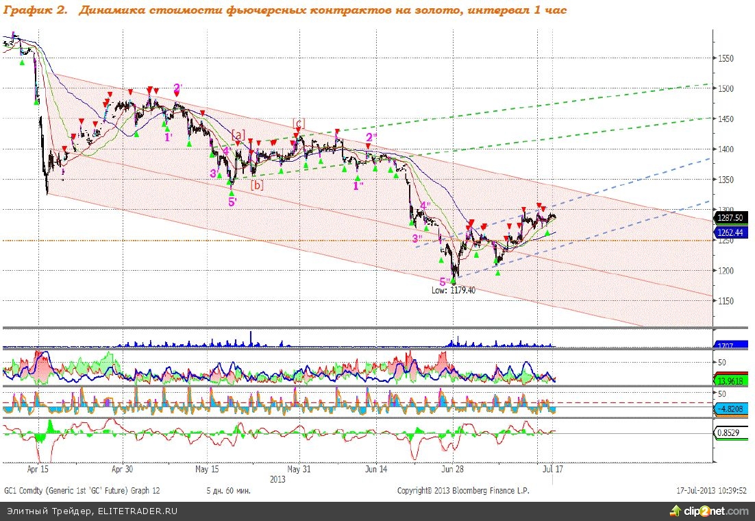 Котировки золота в конце июня достигли нижней границы нисходящего канала, который обозначен на графике 2 красным цветом, где нашли поддержку. В настоящее время цены на драгоценный металл движутся вверх в локальном канале (синие пунктирные линии) в рамках нисходящего ценового коридора (красный канал) и приблизились к обозначенной нами ранее цели в $1300 за унцию, где консолидируются. Ожидаем продолжения роста стоимости золота к уровню $1320 за тройскую унцию