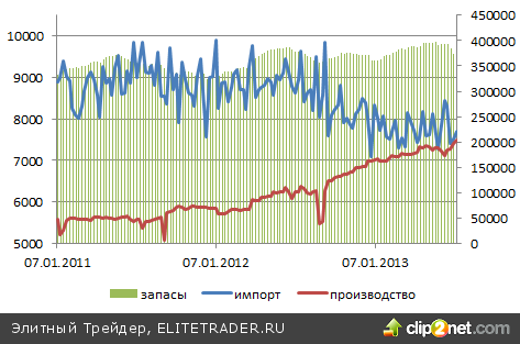 Тенденция к увеличению запасов связана с наращиванием масштабов добычи и сокращением ввоза. Падение показателя во второй половине 2011 года и в 2012 году обусловлено снижением объема производства. В настоящее время импорт вплотную приблизился к добыче, а в таких условиях даже увеличение спроса не способно привести к резкому падению запасов. Если только производители, стремясь подтолкнуть цены на нефть выше, не перевели ее из официальных резервов в неофициальные, например в танкеры, расположенные в портах, или не проводят манипуляции с отчетностью.