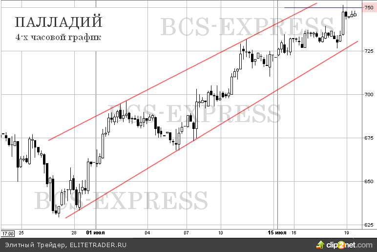 Прибавив почти 2% за четверг, цена палладия достигла отметки $750 за унцию. Пока торговля идет в восходящем канале. Скоро рынку придется преодолевать более важные сопротивления.