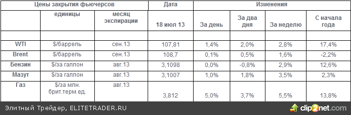 По итогам четверга цена европейской нефти марки Brent не показала существенного изменения. В то же время цена нефти в США вновь подросла. Прибавка к цене составила 1,4%. Кто-то пытается связать рост цен с улучшением состояния американской экономики, динамику которого расценивают как более обнадеживающую, чем в Европе или в Китае. В США действительно появляются некоторые признаки оживления. Так, в четверг стало известно о снижении на числа первичных обращений за пособиями по безработице, которые за последнюю неделю спустились с 360 до 334 тысяч. Но экономические новости не должны были дать столь резкого воздействия. Так же как и чуть утратившая динамизм обстановка в Египте. Но скорей цены на нефть марки WTI выросли в четверг, 17 июля, отреагировав на известие о более значительном, чем ожидалось, сокращении запасов нефти в США. Продолжившийся рост цен на нефть марки WTI происходил на фоне выхода данных Министерства энергетики о запасах нефти, которые показали очередное снижение. По данным на 12 июля коммерческие запасы нефти в Кушинге составили 367,016 млн. баррелей, что на 6,9 млн. баррелей ниже, чем неделей раньше. А за три недели запасы опустились на рекордные 27,1 млн. баррелей. Такое резкое снижение запасов изменяет всю картину и вызывает беспокойство трейдеров. Немного успокаивало лишь то, что суммарные запасы моторного топлива за прошедшую неделю немного выросли с 221,028 до 224,083 млн. баррелей.