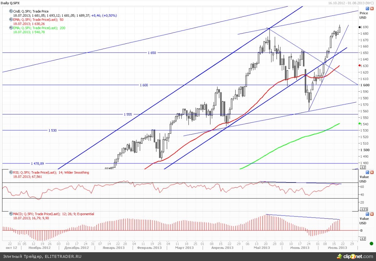 Подобному развитию событий способствовали выходящие отчеты крупнейших корпораций, а также выступление главы ФРС в Конгрессе. Безусловно, полугодовой отчет Бернанке ждали в большей степени, чем любых других новостей, но к каким-то среьезным движениям на этот раз выступление председателя не привело. Собственно инвесторы довольствовались тем, что он хотя бы не принес нового негатива, в виде уточняющих деталей относительно возможного сокращения стимулирования в текущем году.