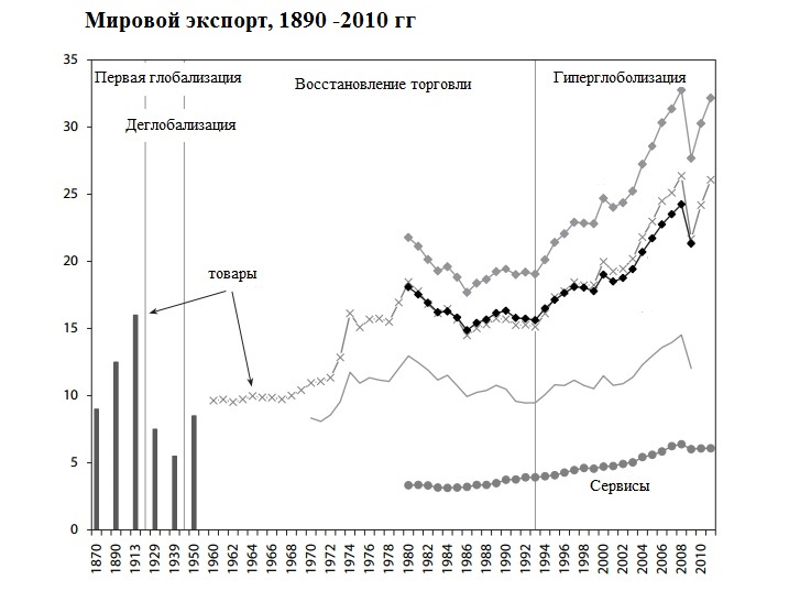 В начале 1990-х годов мир вступил в эпоху, которую экономисты окрестили гиперглобализацией. Чем-то эта эпоха похожа на период между 1870 и 1914 годами, тогда за 40 лет объем мировой торговли вырос на 8%. Столицей мировой торговли ыл Лондон. Великий экономист Джон Мейнард Кейнс как-то сказал, что в то время житель Лондона, потягивая утренний чай в кровати, мог заказать по телефону на дом продукты со всего света, в любом количестве, и уже к завтраку они были бы доставлены к его двери.