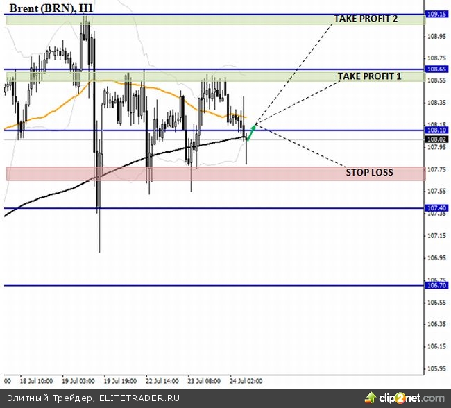 Покупаем если цена закроется выше 200-часовй скольязщей (108,04) с целями в областях 108,65 или 109,15 долларов. Stop-Loss= 107,70