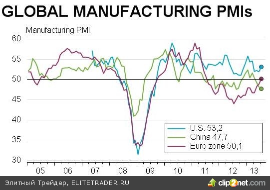 Таким образом, индекс деловой активности в производственном секторе США за июль вырос до 53,2, аналогичный показатель еврозоны впервые поднялся выше 50 и составил 50,1 пункта, а китайский PMI упал в район 47,7.