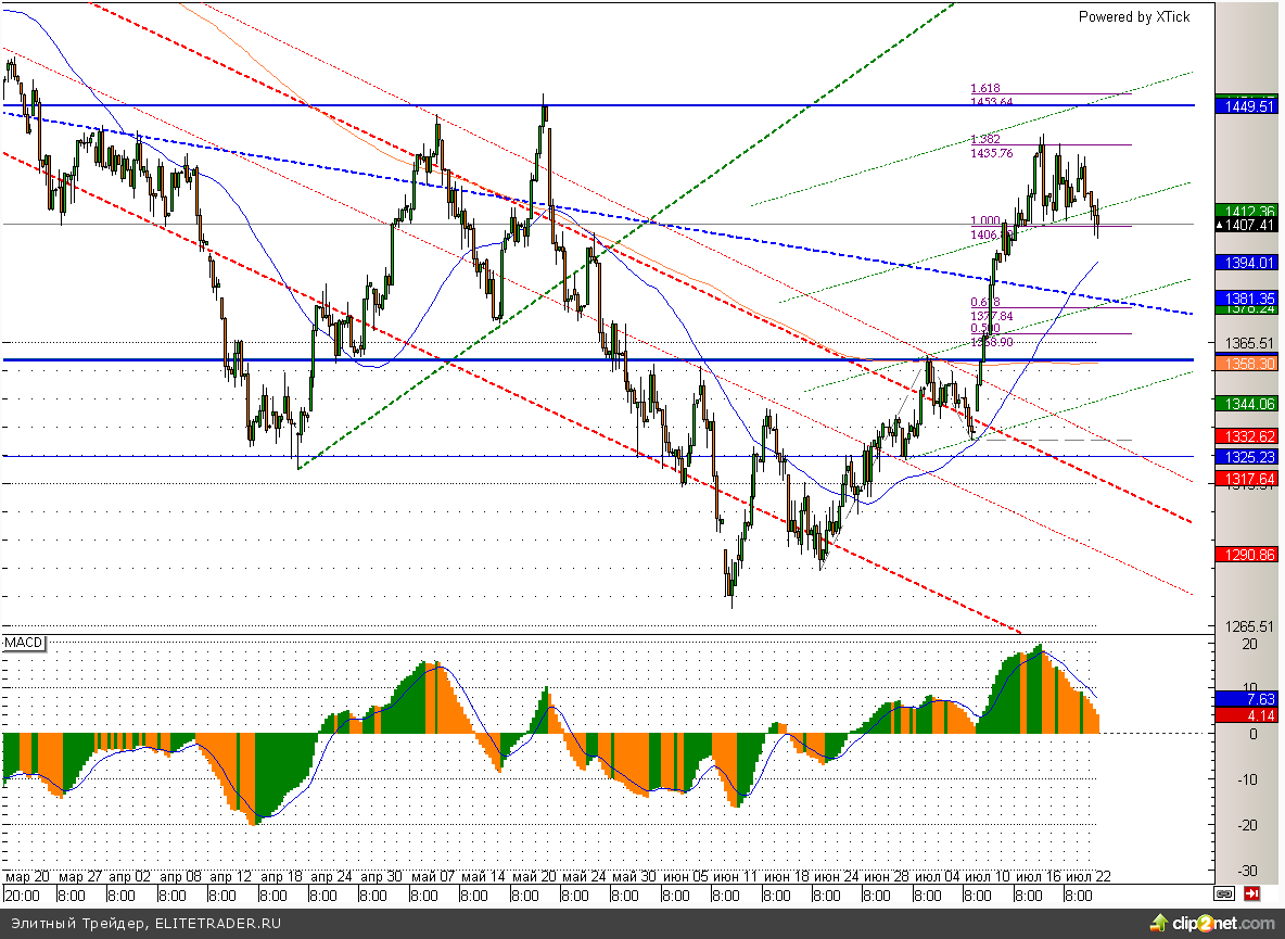Российский рынок завершил торговую сессию среды снижением на 0,7% по индексу ММВБ. При этом индекс вернулся в район 1400, где располагается очень неплохая поддержка. Отсюда рост вполне может продолжиться, если внешние факторы будут этому благоприятствовать. Впрочем, вероятность снижения в район 1380 также присутствует. Сегодняшний день стал хорошим показателем в этом плане. Отличная статистика по ходу торговой сессии выходила, как по экономике еврозоны, так и по Америке, но единственно плохих данных по Китаю с лихвой хватило, чтобы перекрыть весь позитив и уйти в глубокий минус.