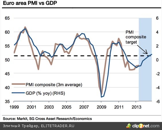 Аналитики Societe Generale видят надежду на восстановление. Последние сильные данные по индексам PMI дают надежду еврозоне на выход из кризиса – французский индекс деловой активности достиг двухлетнего максимума, немецкий индикатор также превысил ожидания.