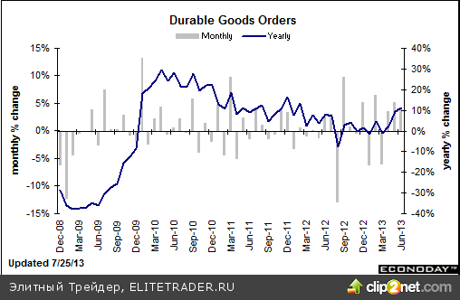 Данные по заказам на товары длительно пользования за июнь не смотря на общий рост в целом, были тревожными в части существенного сокращения заказов компьютерной и электронной продукции. Общий показатель вырос на 4,2% превысив ожидаемые 1,3%, притом, что предыдущее значение было пересмотрено с 3,7% до 5,2%, при этом значительный вклад в эти цифры был сделан за счет роста заказов на самолеты.