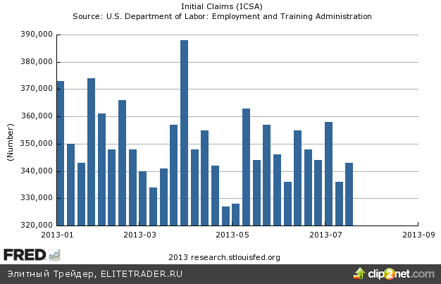 Обнародованная статистика по рынку труда показала небольшой рост первичных обращений за пособиями по безработице на 7 тыс. до 343 тыс., превысив ожидаемые 340 тыс. Тем не менее, в целом июльские данные по заявкам пока не вызывают никакого беспокойства соответствуя уровням последних месяцев, что не дает повода говорить о преждевременном сворачивании стимулирования со стороны ФРС, от которой ожидают сокращения покупок уже в сентябре c $85 до $65 млрд.